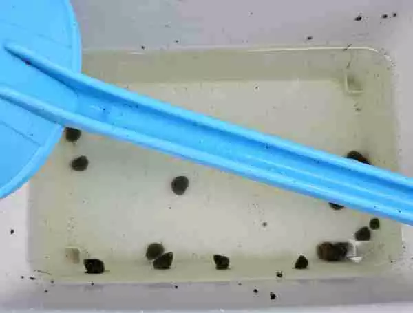 移動するヒメカニシ(今回は5匹)を、水合せするためのに、少しの元飼育水と一緒に、小さな容器に入れます。