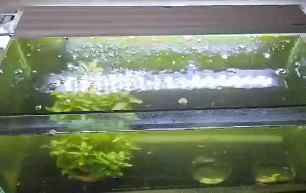 水面から離れていることで、泡の破裂から発生する水滴が当たらなくなったことや、光量がやや低いので、水草の生育に望ましいことが挙げられます。