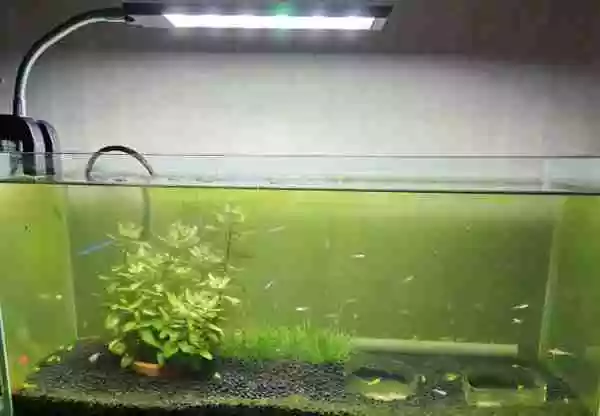 白濁りの様子は以前に掲載していますが、その後にはグリ-ンウォ-タ-化している水槽になりました。